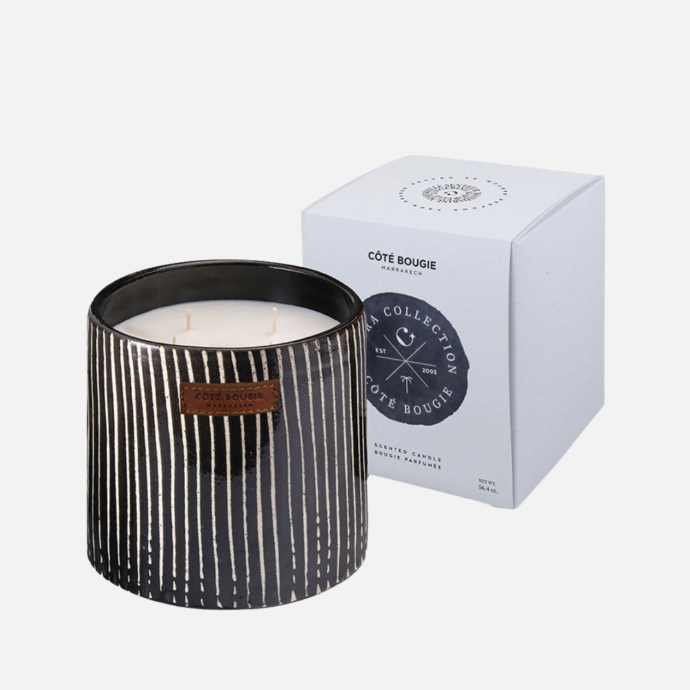 Zebra Black Scented Candle — a bold, refined piece crafted in Marrakech. The black ceramic jar features fine, hand-painted white stripes by skilled artisans, making each candle truly unique. Its elegant fragrance, created in Grasse, infuses your space with a sophisticated ambiance.