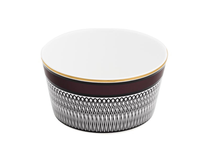 Expertly crafted from fine bone china, the bowl features a deep burgundy base adorned with black curvy patterns and asymmetrical Art Nouveau-inspired lines. A delicate gold rim completes its opulent design, bringing a sense of timeless elegance to any table setting.