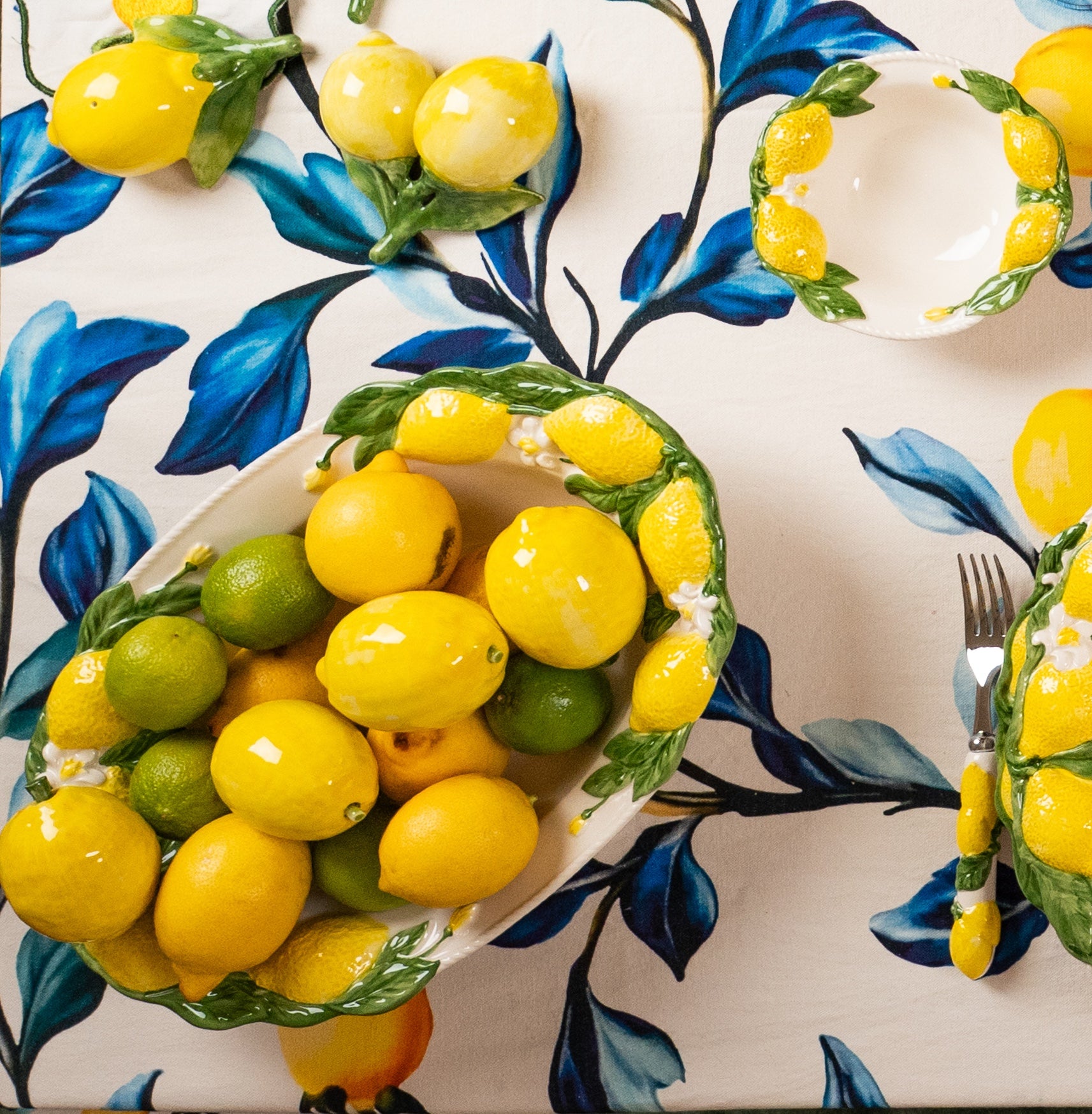 Perfect for entertaining and everyday use, this glazed ceramic platter is sized for antipasti, cheeses, fruit, or desserts, and also shines as a decorative centerpiece. Pair it with coordinating Lemon Collection ceramics, embroidered linens, coasters, and placemats to create a cohesive, maximalist tablescape.