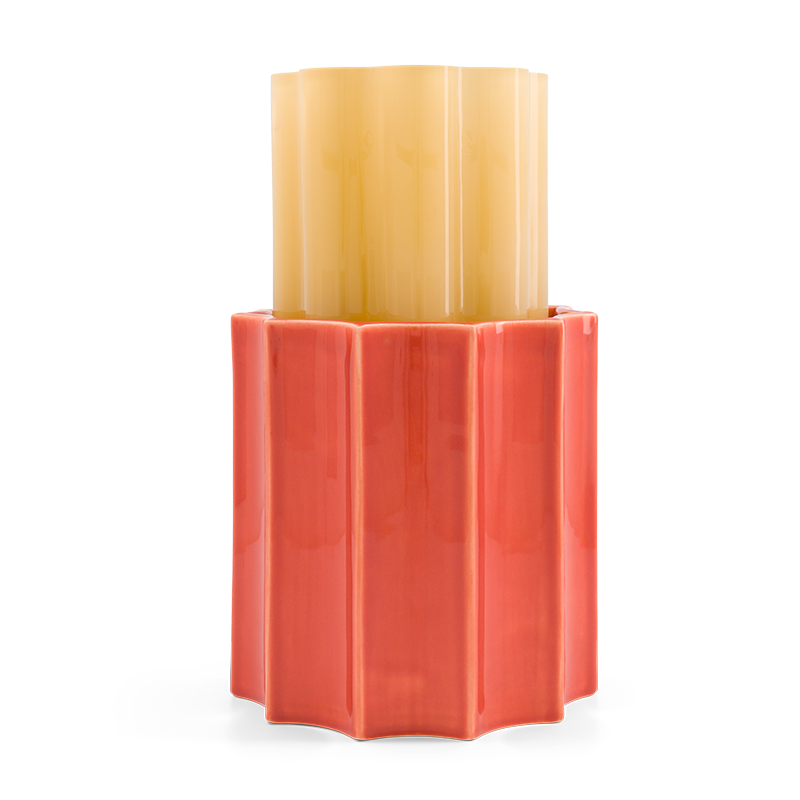 Sculptural and timeless, the Duetto Vase pairs hand-glazed terracotta with mouth-blown amber glass in a modular, two-part design. Each piece reflects the warmth of craftsmanship and the elegance of modern form — striking alone or with flowers.