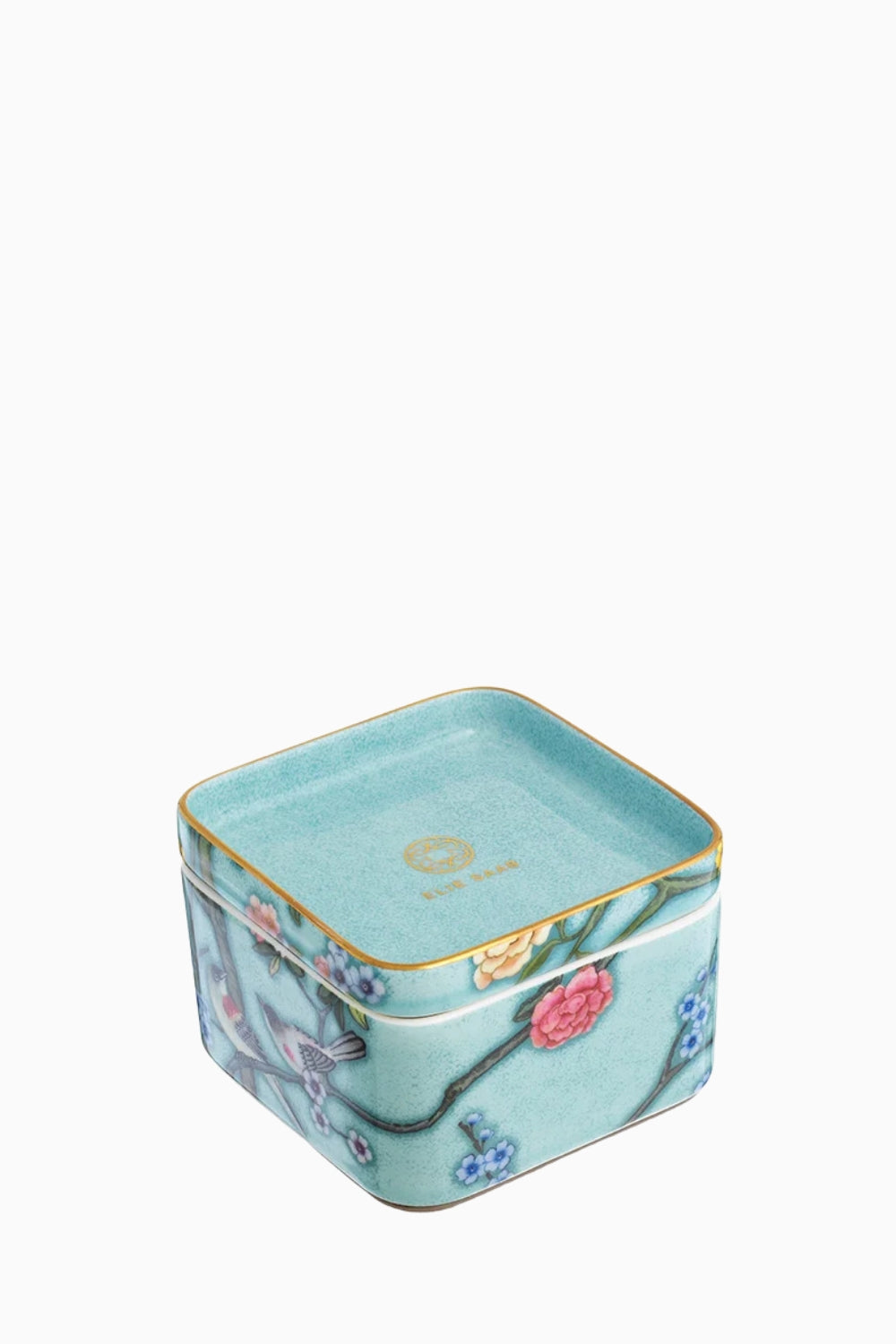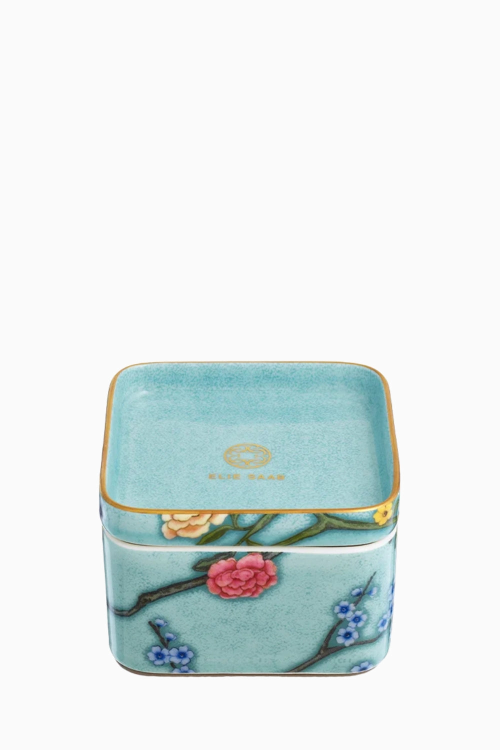 Crafted from Prime porcelain, the 12cm square box features a solid sky-blue lid embellished with the iconic Elie Saab monogram, symbolizing timeless sophistication. The genuine Italian leather base adds a touch of opulence while protecting surfaces with refined practicality.