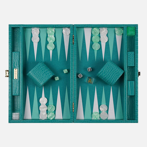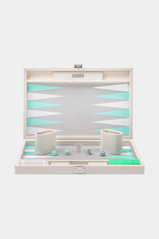 Our Grey backgammon set with Ostrich pattern is carefully crafted with vegan leather, premium checkers and dice, and our signature VIDO doubling cube made of genuine crystal