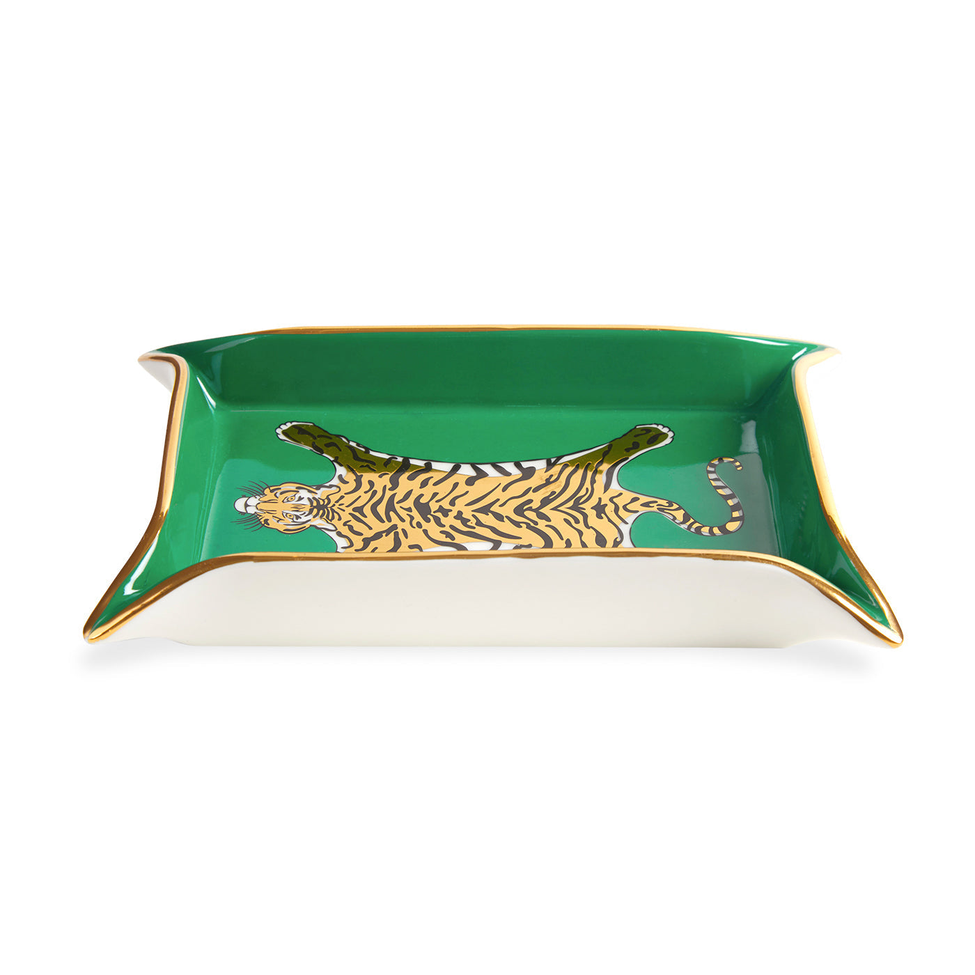 Featuring a bold emerald backdrop and a tiger rug-inspired design, it’s the perfect piece for holding keys, jewelry, coins, or other small treasures. Packaged in a chic gift box, the Tiger Valet Tray makes an exceptional hostess gift or a stylish self-indulgence.