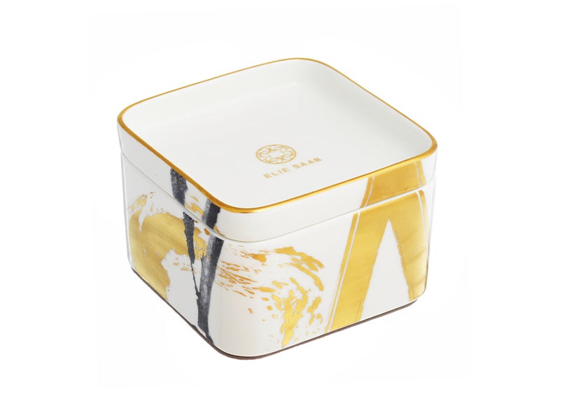 Measuring 12cm, this compact yet luxurious box is crafted from Prime porcelain and finished with a genuine Italian leather base for added opulence and protection. Its white leather lid, accentuated with a gold rim and the elegant Elie Saab monogram, completes its refined aesthetic. Perfect for storing chocolates, jewelry, or keepsakes, it seamlessly blends practicality with exquisite design.
