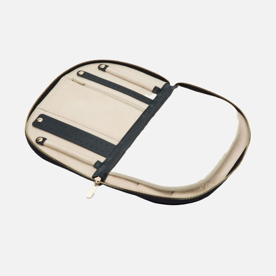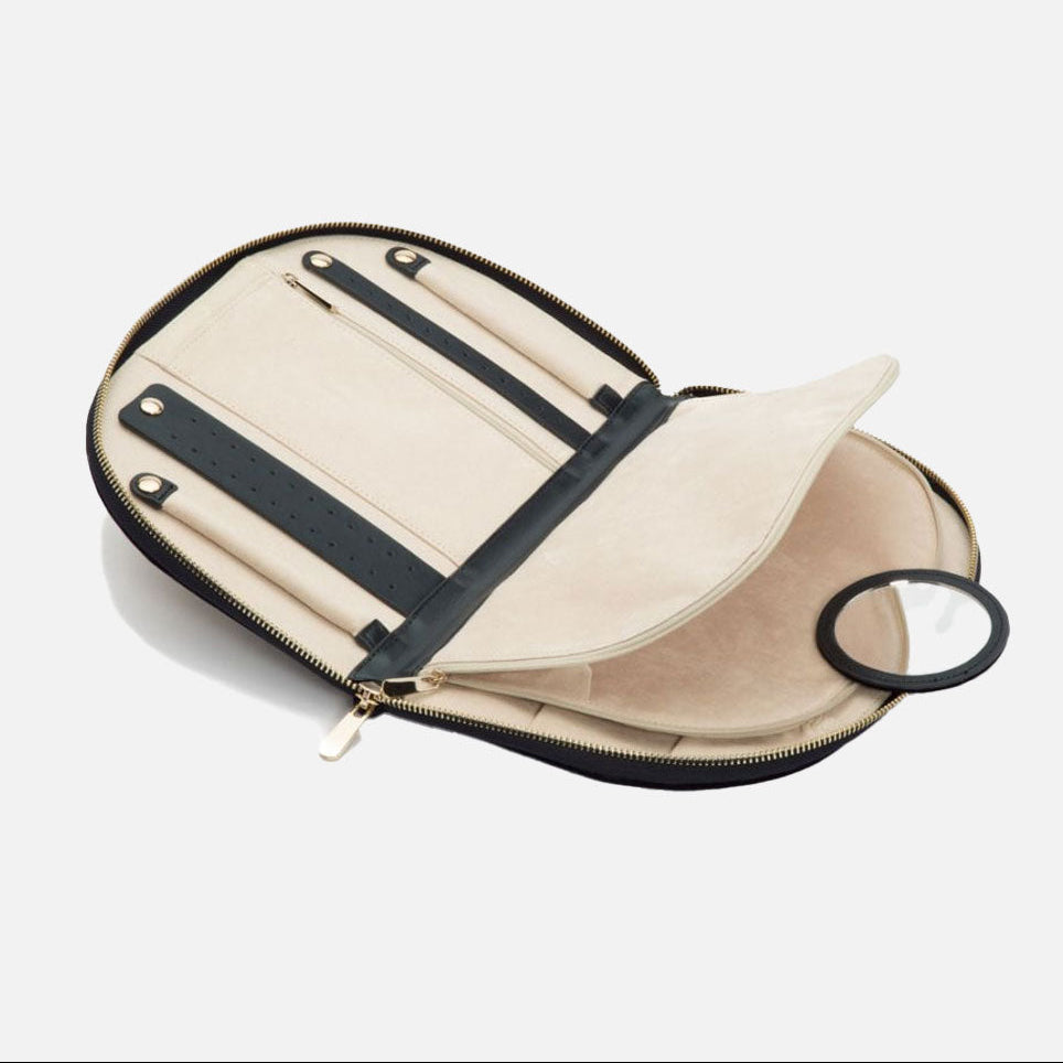 • Organisation: Includes dual earring holders, two ring rolls, medium and large zip pockets, multiple necklace tabs and a removable round mirror. :contentReference[oaicite:5]{index=5}